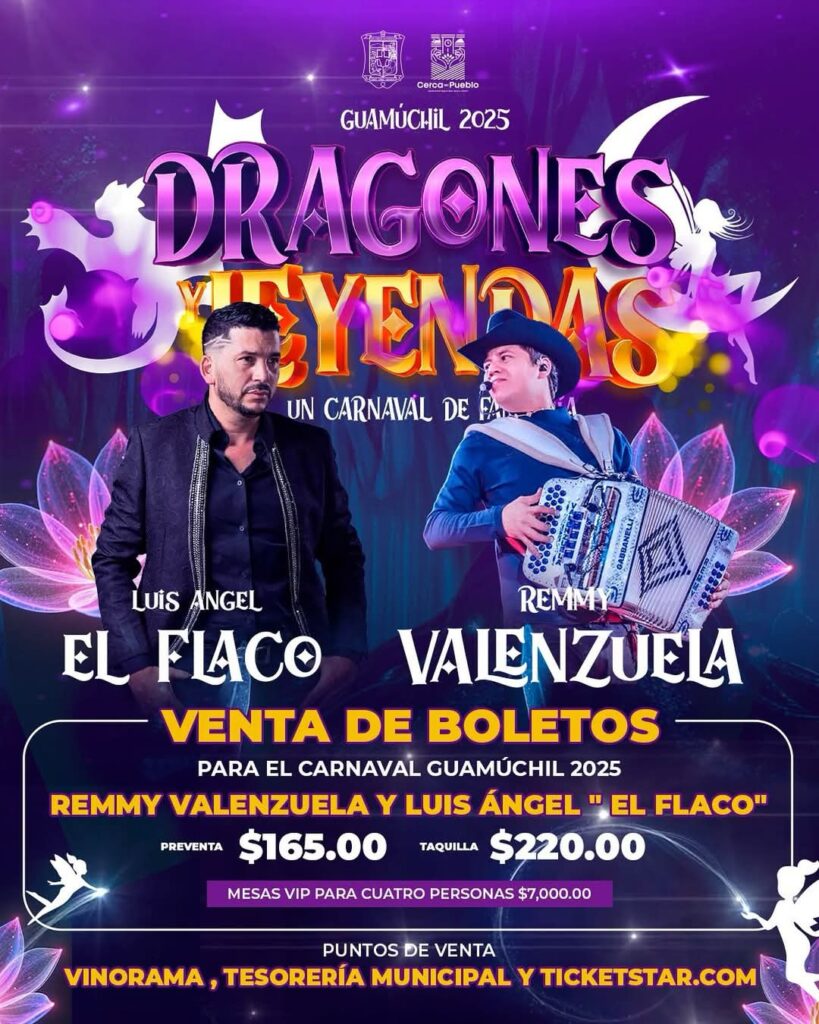 La fiesta más esperada del año está por llegar. El Carnaval Guamúchil 2025 trae un espectáculo inolvidable con Remmy Valenzuela y Luis Ángel “El Flaco”. Aprovecha la preventa por solo $165.00 o adquiere tus boletos en taquilla por $220.00. Si buscas una experiencia exclusiva, las mesas VIP para cuatro personas están disponibles por $7,000.00. Consigue tus boletos en Vinorama, Tesorería Municipal y Ticketstar.com. ¡No te quedes fuera de esta gran celebración! 🎭🎶🔥