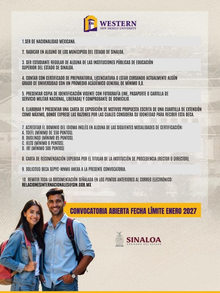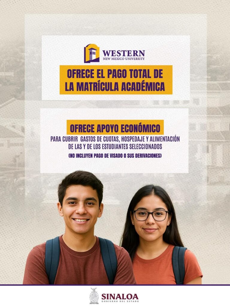 El Gobierno del Estado de Sinaloa y Western New Mexico University te invitan a postularte para obtener una beca de estudios universitarios en el campus Silver City, EUA.