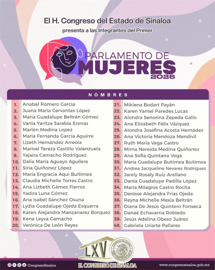 Culiacán, Sinaloa. A 20 de marzo de 2026.-La Junta de Coordinación Política (JUCOPO) y la Comisión de Igualdad, Género, Diversidad Sexual e Inclusión, del Congreso del Estado de Sinaloa, integradas en Jurado del Parlamento de Mujeres, eligieron por unanimidad, este viernes 20 de marzo, a las 40 mujeres que durante dos días (26 y 27 de marzo) formarán parte del primer Parlamento de Mujeres.