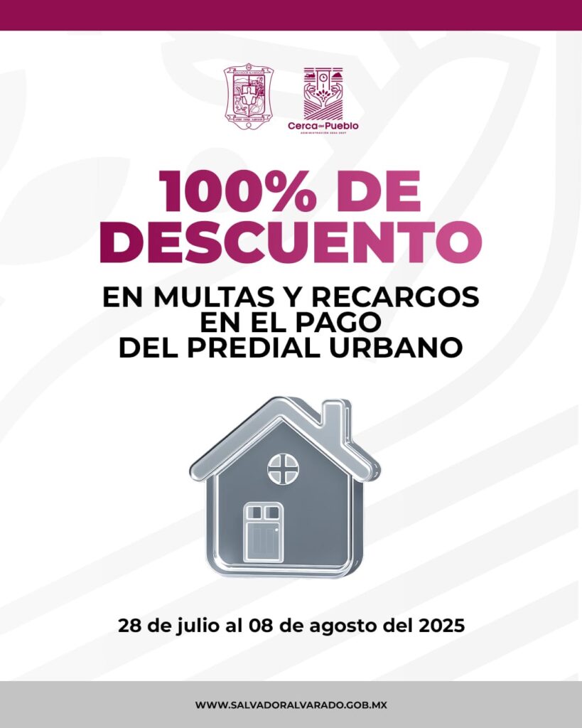 Guamúchil, Sinaloa; a 22 de julio del 2025.– El Ayuntamiento de Salvador Alvarado anunció un nuevo periodo de descuentos en el pago del impuesto predial urbano. Del 28 de julio al 8 de agosto, la Tesorería Municipal aplicará el 100% de descuento en multas y recargos, con el objetivo de que más ciudadanos puedan ponerse al día.