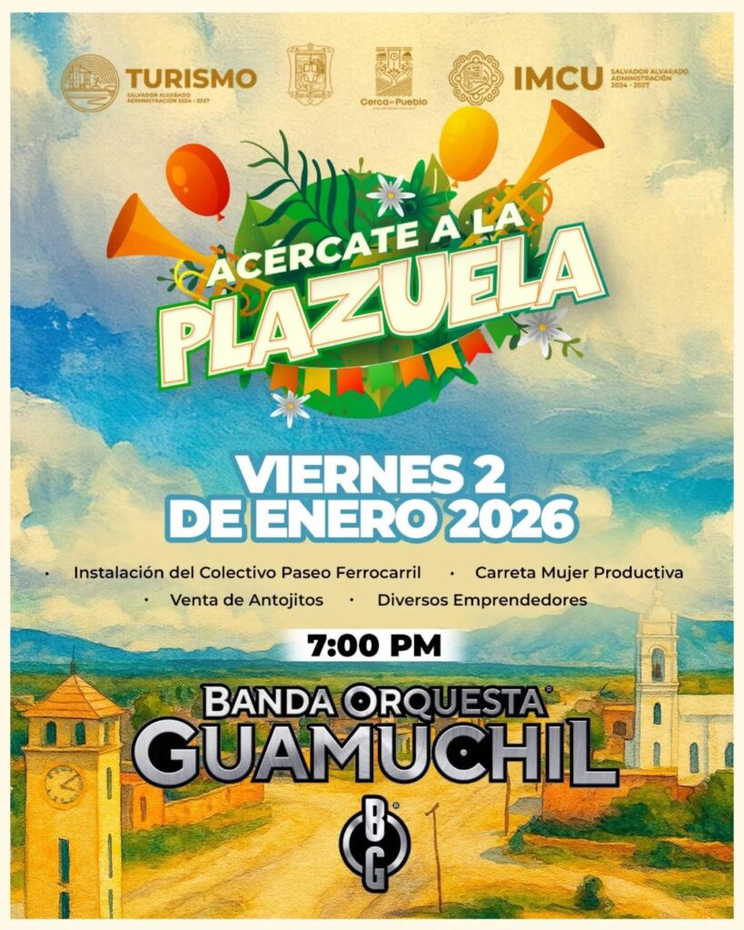 Acércate a la Plazuela este viernes 02 de enero a partir de las 4:00 pm Disfruta de deliciosos antojitos y apoya a diversos emprendedores locales, y más tarde, a las 07:00 pm, déjate llevar por la música de Banda Orquesta Guamúchil 🎶🙌🏻💃🏻