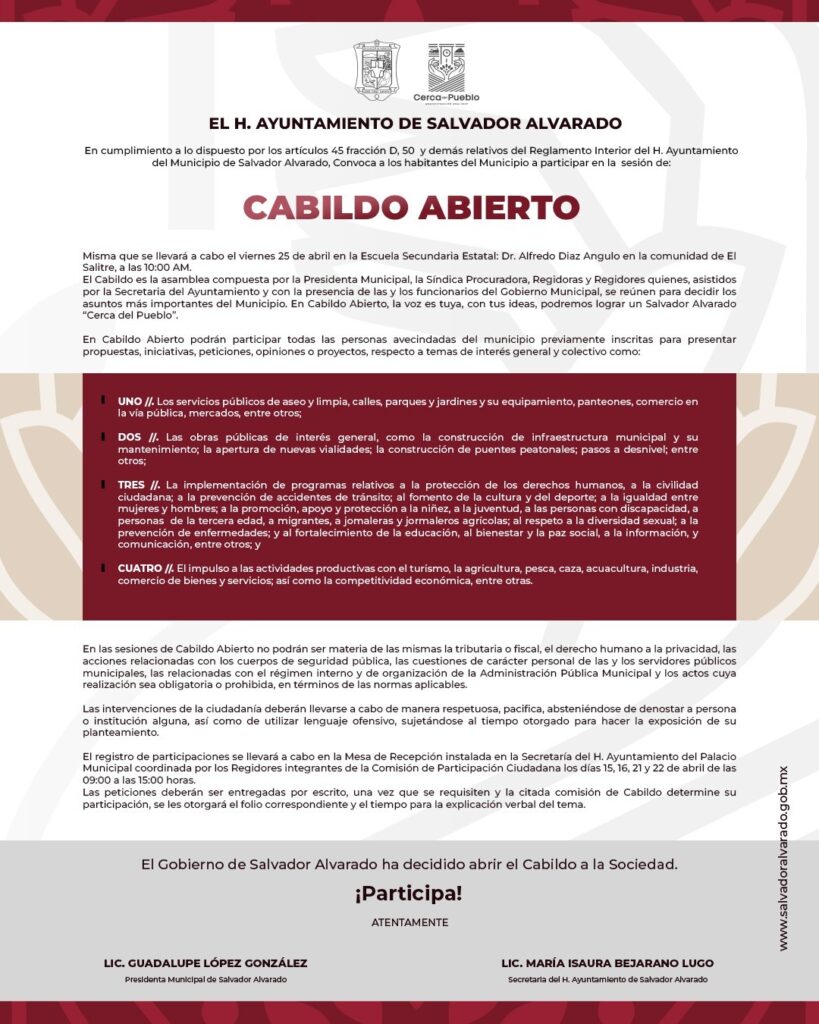 Guamúchil, Sinaloa; a 14 de abril del 2025.- La secretaria del Ayuntamiento de Salvador Alvarado, María Isaura Bejarano Lugo, anunció que este mes de abril, el Cabildo Abierto se trasladará a las comunidades rurales, siendo El Salitre la próxima sede de este ejercicio de participación ciudadana.