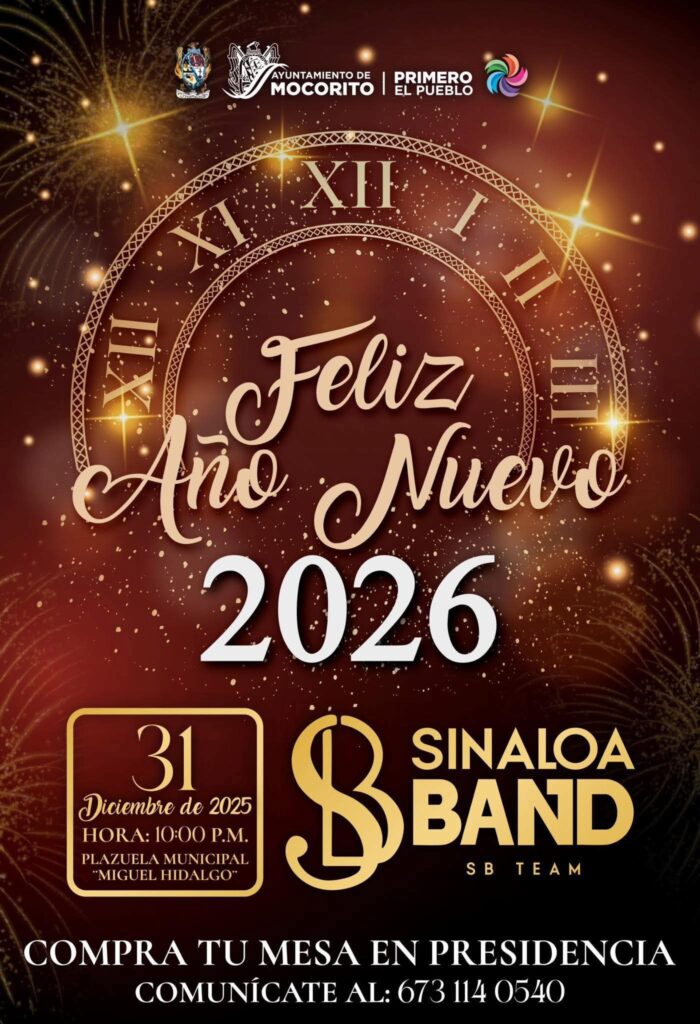 El Ayuntamiento de Mocorito, a través de la Dirección de Turismo Municipal, te invita a vivir una noche inolvidable para decir adiós al 2025 y dar la bienvenida al Año Nuevo en un ambiente lleno de música, alegría y tradición, en la emblemática Plazuela Miguel Hidalgo.