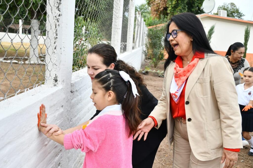 López López manifestó que cada mano pintada es un mensaje de paz y subrayó que se están visitando las primarias porque la educación también transforma y protege.