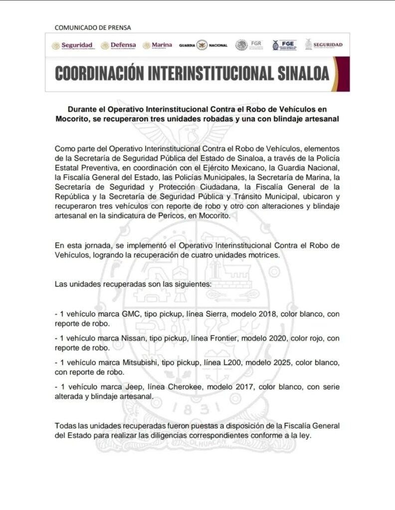 Como parte del Operativo Interinstitucional Contra el Robo de Vehículos, elementos de la Secretaría de Seguridad Pública del Estado de Sinaloa, a través de la Policía Estatal Preventiva, en coordinación con el Ejército Mexicano, la Guardia Nacional, la Fiscalía General del Estado, las Policías Municipales, la Secretaría de Marina, la Secretaría de Seguridad y Protección Ciudadana, la Fiscalía General de la República y la Secretaría de Seguridad Pública y Tránsito Municipal, ubicaron y recuperaron tres vehículos con reporte de robo y otro con alteraciones y blindaje artesanal en la sindicatura de Pericos, en Mocorito.