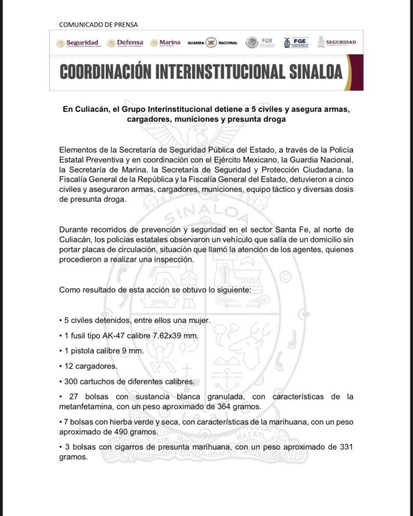En Culiacán, el Grupo Interinstitucional detiene a 5 civiles y asegura armas, cargadores, municiones y presunta droga