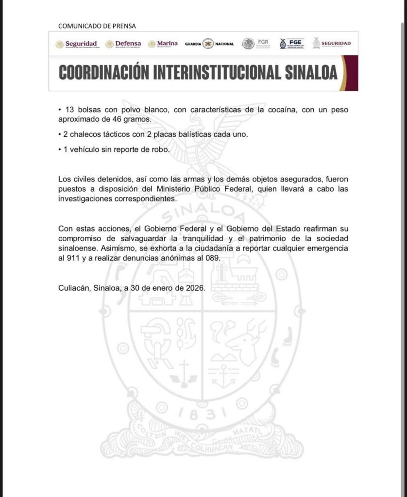 Con estas acciones, el Gobierno Federal y el Gobierno del Estado reafirman su compromiso de salvaguardar la tranquilidad y el patrimonio de la sociedad sinaloense. Asimismo, se exhorta a la ciudadanía a reportar cualquier emergencia al 911 y a realizar denuncias anónimas al 089.