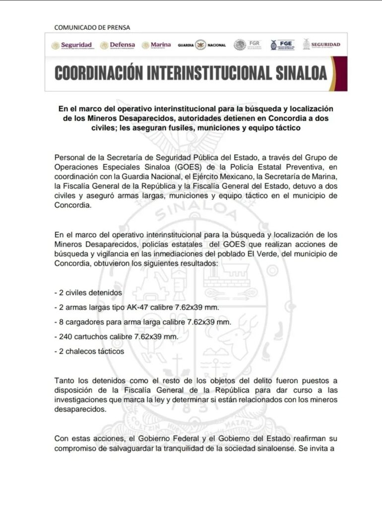 Tanto los detenidos como el resto de los objetos del delito fueron puestos a disposición de la Fiscalía General de la República para dar curso a las investigaciones que marca la ley y determinar si están relacionados con los mineros desaparecidos.