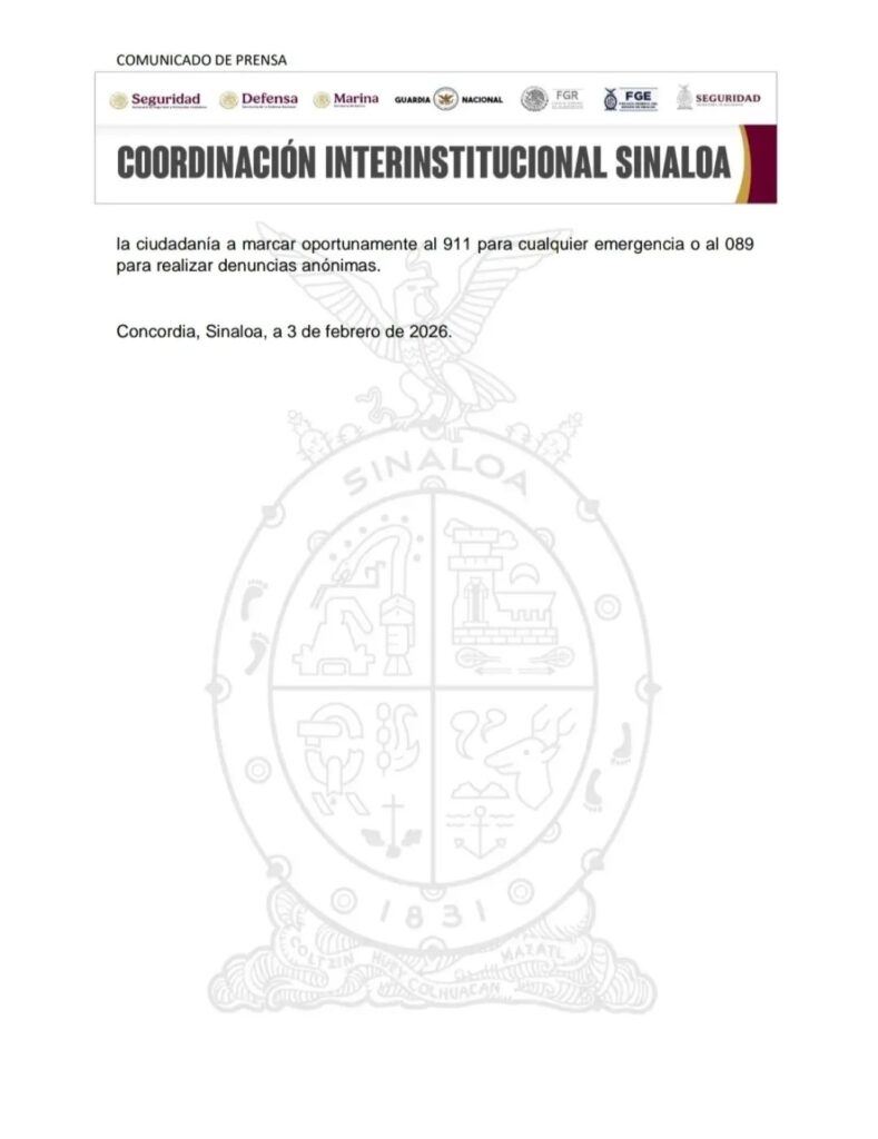 Con estas acciones, el Gobierno Federal y el Gobierno del Estado reafirman su compromiso de salvaguardar la tranquilidad de la sociedad sinaloense. Se invita a la ciudadanía a marcar oportunamente al 911 para cualquier emergencia o al 089 para realizar denuncias anónimas.