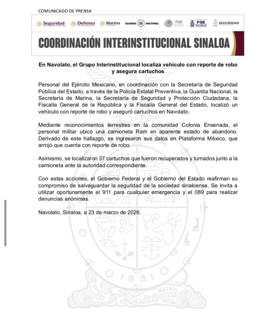 Personal del Ejército Mexicano, en coordinación con la Secretaría de Seguridad Pública del Estado, a través de la Policía Estatal Preventiva, la Guardia Nacional, la Secretaría de Marina, la Secretaría de Seguridad y Protección Ciudadana, la Fiscalía General de la República y la Fiscalía General del Estado, localizó un vehículo con reporte de robo y aseguró cartuchos en Navolato.