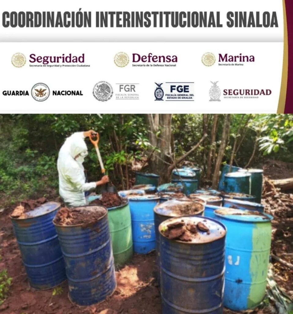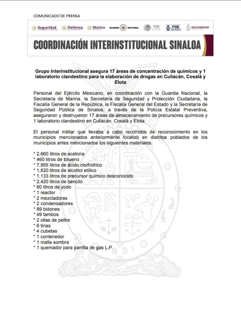 Personal del Ejército Mexicano, en coordinación con la Guardia Nacional, la Secretaría de Marina, la Secretaría de Seguridad y Protección Ciudadana, la Fiscalía General de la República, la Fiscalía General del Estado y la Secretaría de Seguridad Pública de Sinaloa, a través de la Policía Estatal Preventiva, aseguraron y destruyeron 17 áreas de almacenamiento de precursores químicos y 1 laboratorio clandestino en Culiacán, Cosalá y Elota.