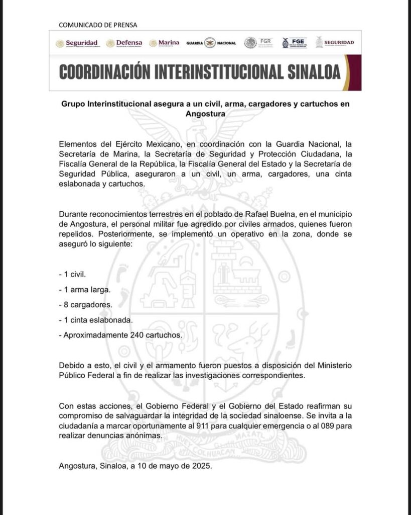 Con estas acciones, el Gobierno Federal y el Gobierno del Estado reafirman su compromiso de salvaguardar la integridad de la sociedad sinaloense. Se invita a la ciudadanía a marcar oportunamente al 911 para cualquier emergencia o al 089 para realizar denuncias anónimas.