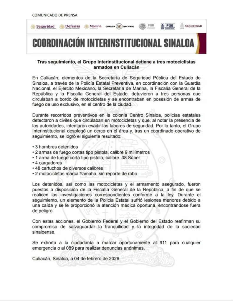 Con estas acciones, el Gobierno Federal y el Gobierno del Estado reafirman su compromiso de salvaguardar la tranquilidad y la integridad de la sociedad sinaloense.