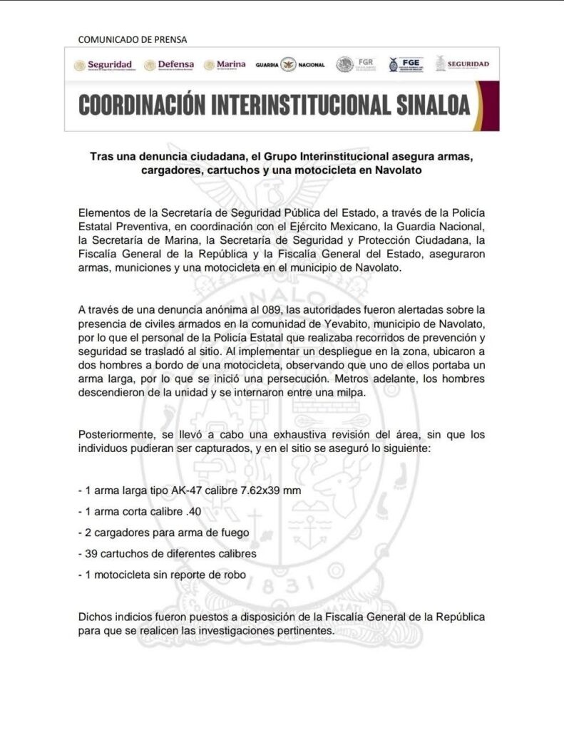 Elementos de la Secretaría de Seguridad Pública del Estado, a través de la Policía Estatal Preventiva, en coordinación con el Ejército Mexicano, la Guardia Nacional, la Secretaría de Marina, la Secretaría de Seguridad y Protección Ciudadana, la Fiscalía General de la República y la Fiscalía General del Estado, aseguraron armas, municiones y una motocicleta en el municipio de Navolato.