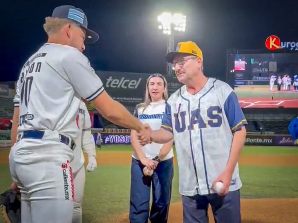 Guasave, Sin.- Como parte de las acciones derivadas del convenio de colaboración entre la Facultad de Ciencias Económicas y Administrativas Guasave y el Club Algodoneros, el vicerrector de la Unidad Regional Centro Norte, Dr. Mario Soto Velázquez, realizó este día el lanzamiento de la primera bola previo al encuentro entre Algodoneros de Guasave y Jaguares de Nayarit.