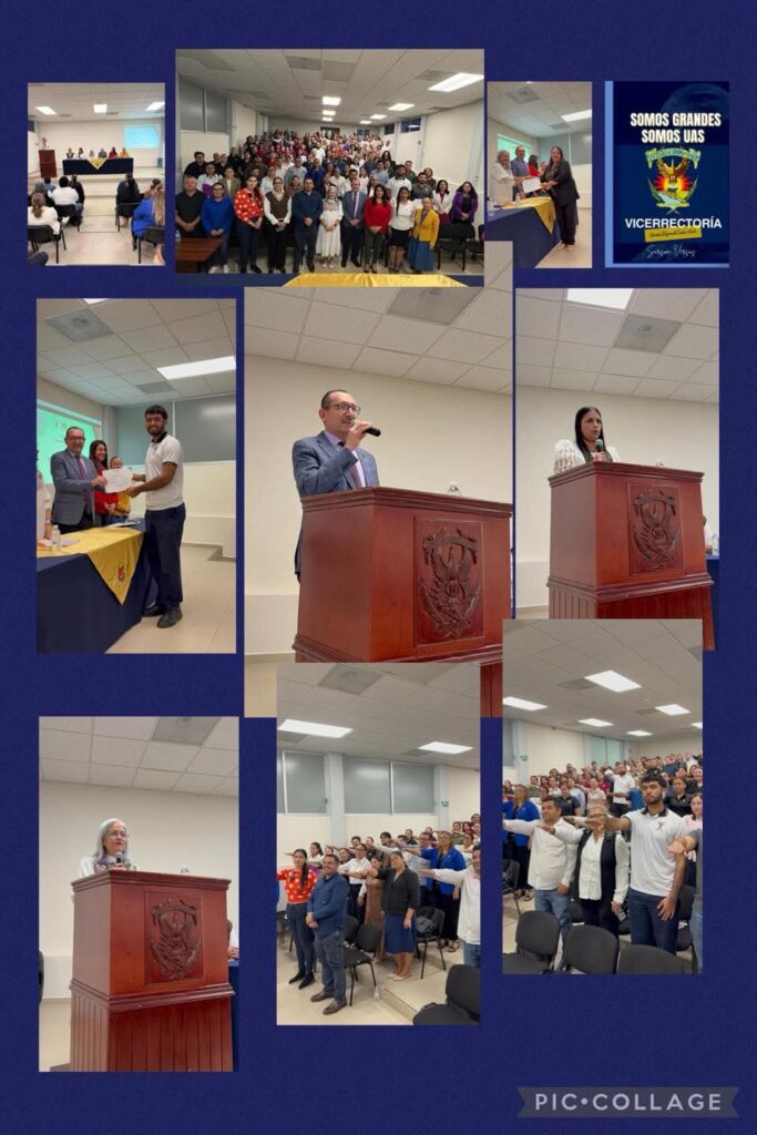 El Dr. Mario Soto Velázquez, vicerrector de la URCN, expresó: “Reciban un cordial y afectuoso saludo del señor rector Dr. Jesús Madueña Molina, quien les manda un agradecimiento por asumir este reto de tomar protesta el día de hoy con este compromiso y responsabilidad, para que juntos sigamos cerrando filas por la universidad y sigamos fortaleciendo la formación integral de los jóvenes estudiantes, esencia, corazón, alma y razón de ser de la UAS”.