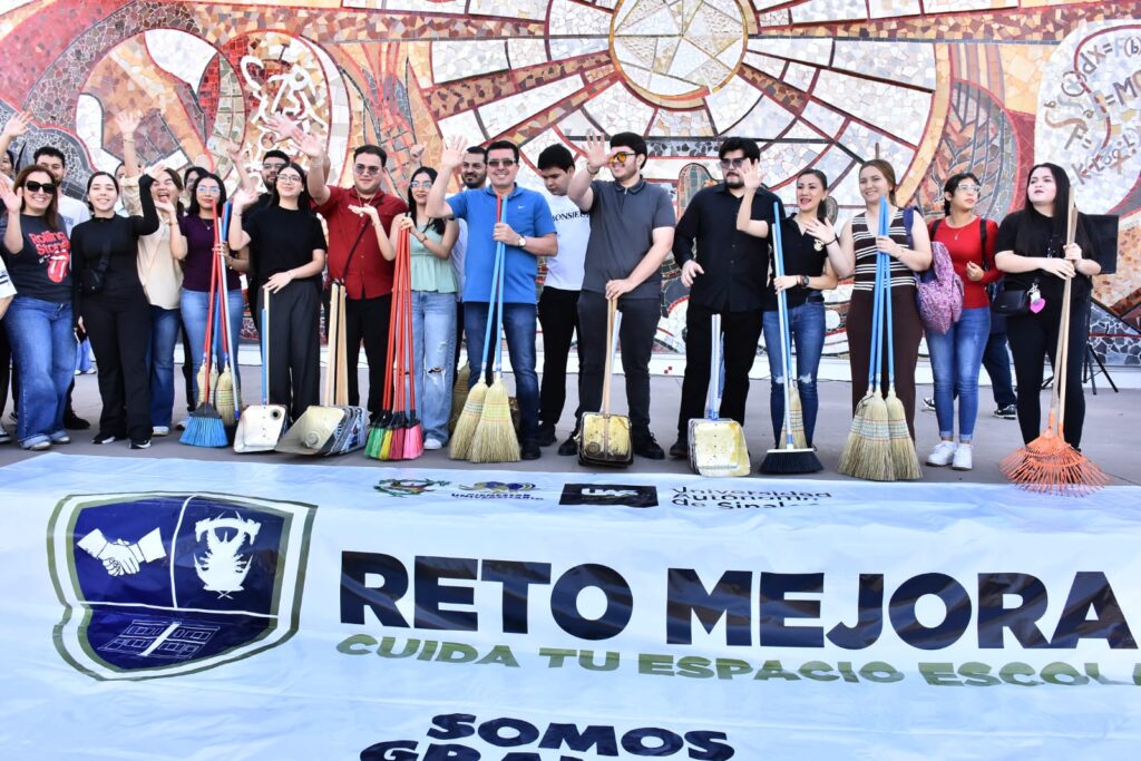 Al pie del emblemático mural “Irradiación para la Cultura y la Vida”, en Ciudad Universitaria, el Rector de la Universidad Autónoma de Sinaloa (UAS), doctor Jesús Madueña Molina —acompañado de la doctora Sofía Angulo de Madueña y la comunidad universitaria— inauguró las actividades del programa institucional “Reto Mejora: Cuida tu Espacio Universitario”.